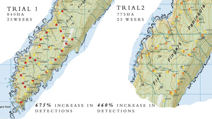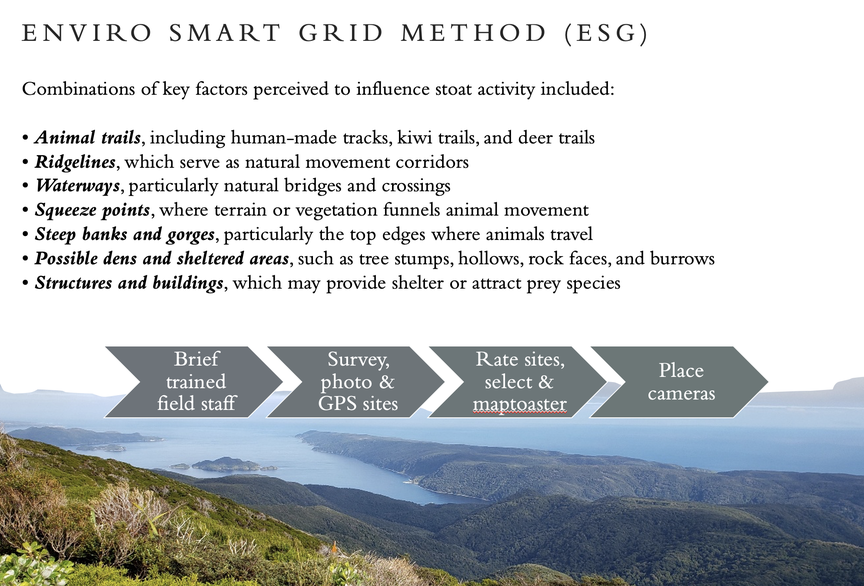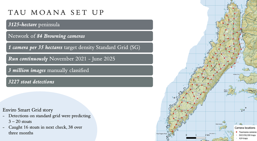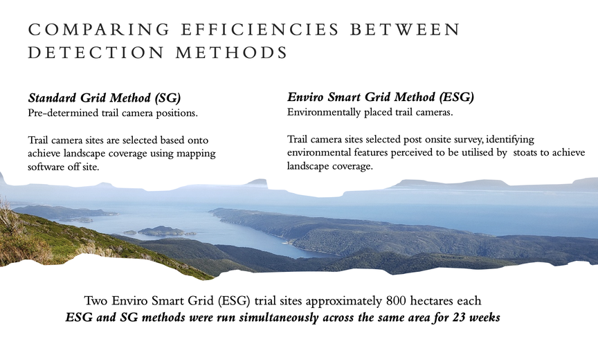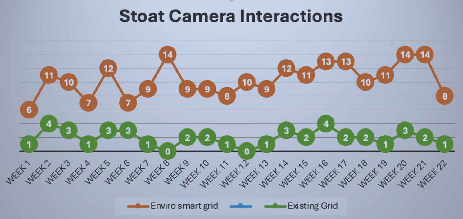 Knowing what is present is key to knowing what to do about it. DETECTION is key and cameras are a wonderful tool but we’re still learning. So we tested a static versus an enviro smart grid... conservatively averaging a 4-5 times increase in terms of sensitivity in stoat detection.